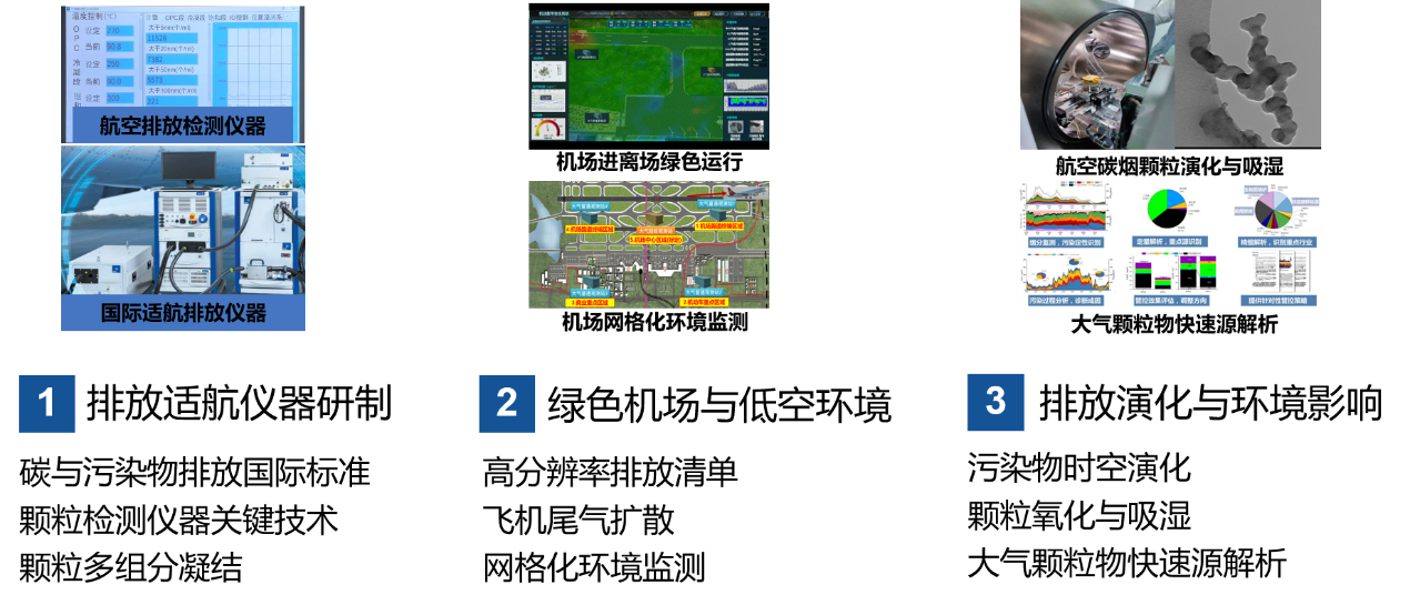 研究2:环境污染与健康,由陈龙飞教授负责,主要研究方向包括航空排放清单构建、污染物检测仪器研发、污染物时空演化规律、航空排放源解析等。实验室拥有航空排放纳米颗粒检测设备、气溶胶发生及粒径检测系统、环境监测系统等先进设备。例如,航空排放纳米颗粒检测设备可精准检测飞机发动机排放的纳米级颗粒物,有效评估航空排放对环境和人体健康的影响。气溶胶发生及粒径检测系统可生成不同粒径的气溶胶,并用于研究气溶胶的扩散、沉降和环境影响。环境监测系统可实时监测低空环境中的污染物浓度,为航空排放的治理提供数据支持。