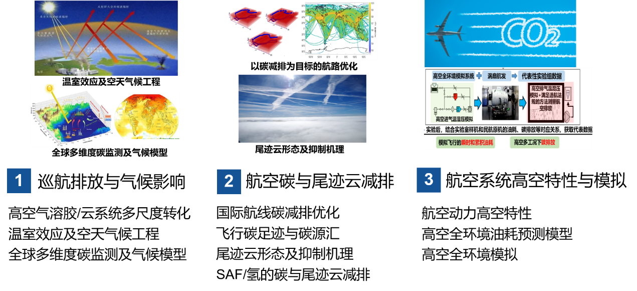 研究3:高空模拟与气候,由陈龙飞教授负责,主要研究方向包括巡航排放与气候影响、航空碳与尾迹云减排技术、航空系统高空特性与模拟等。实验室拥有多功能高空全环境模拟舱、微纳表征洁净间、航空排放测试区、三大低碳航空动力试车台等先进设备。例如,多功能高空全环境模拟舱可模拟海平面至海拔12km范围内的真实全环境条件(温湿压),并具备航空尾迹云形成及演化模拟、小型航空发动机全身高空环境试验、污染物在真实气象条件下的扩散演化等多种创新功能。微纳表征洁净间可提供高洁净度环境,用于航空排放测试,确保测试结果的准确性和可靠性。航空排放测试区配备了满足最新适航标准的航空排放测量系统,可用于检测飞机发动机排放的气态污染物和颗粒物。三大低碳航空动力试车台可进行各类航空发动机的高空模拟试验,为研究航空系统的高空特性提供平台。